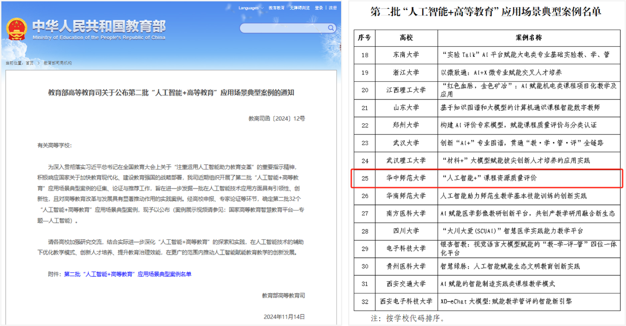 11月14日,教育部高教司公布了全国第二批32个“人工智能+高等教育”应用场景典型案例,我校“‘人工智能+’课程资源质量评价”成功入选。