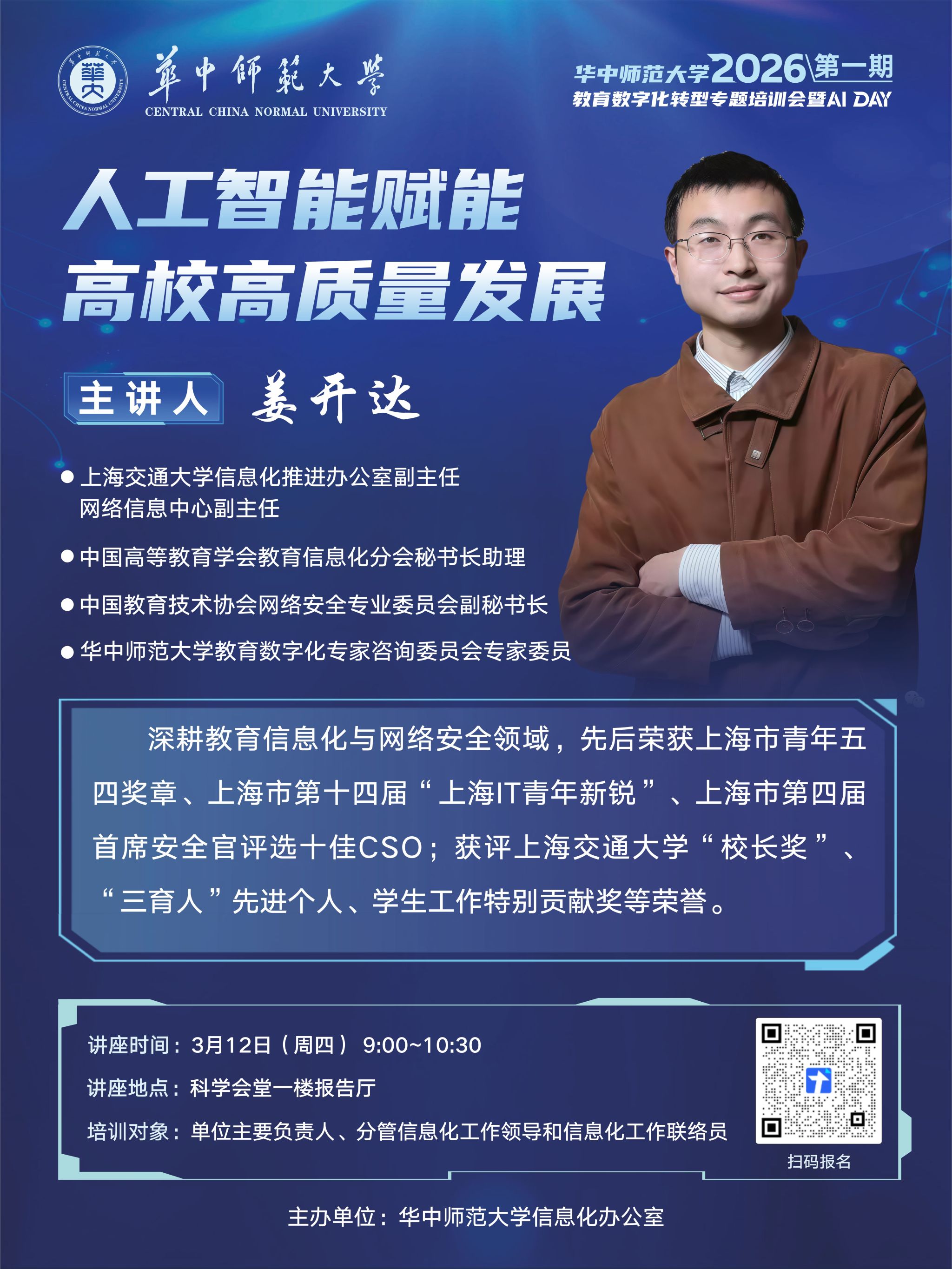 姜开达 上海交通大学信息化推进办公室副主任、网络信息中心副主任。兼任中国高等教育学会教育信息化分会秘书长助理、中国教育技术协会网络安全专业委员会副秘书长、我校教育数字化专家咨询委员会专家委员。该同志长期深耕教育信息化与网络安全领域,业绩卓著。先后荣获上海市青年五四奖章、上海市第四届“十佳首席安全官(CSO)、上海市第十四届“IT青年新锐”等行业重磅奖项;曾获上海交通大学最高荣誉“校长奖”,“学生工作特别贡献奖”、“三育人”先进个人等表彰。