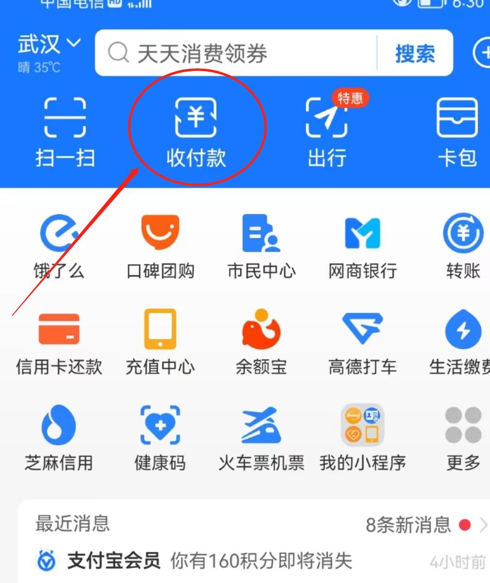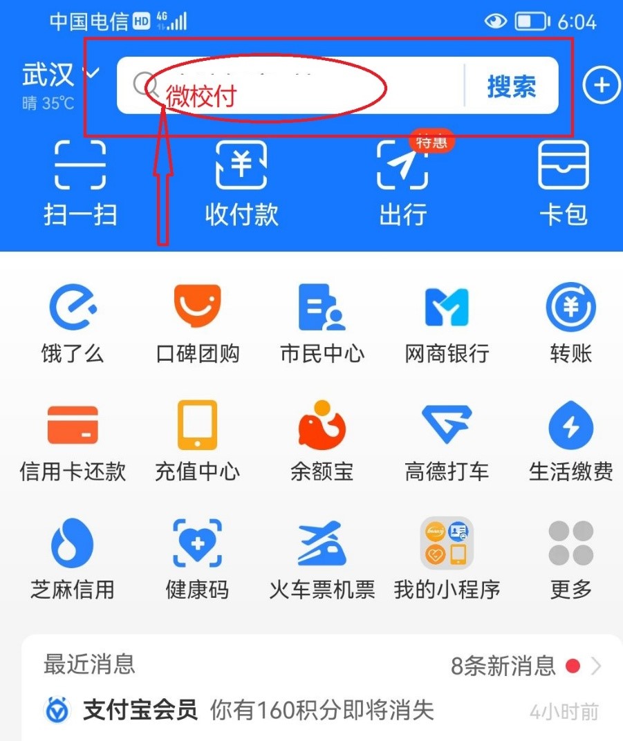 第一步  打开支付宝APP,在首页第一行中搜索小程序“微校付”。