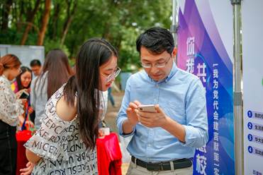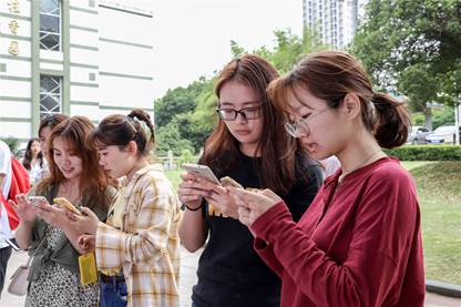 学生用手机参与“你我携手共建智慧校园”的问卷调研活动