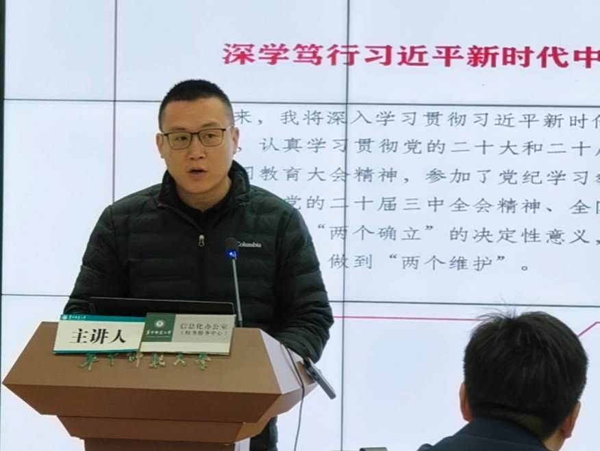 大会第一阶段领导班子和领导干部述职述廉环节中,信息化办公室主任吴绍靖代表领导班子作述职汇报。吴绍靖对2024年信息化办公室领导班子的工作从政治素养与理论学习、从严治党和党风廉政建设、工作业绩和主要成效四个方面进行了总结,全方位展示单位在2024年度取得的成绩,并表示新的一年将再接再厉,主动谋划学校教育数字化转型工作,积极对标学校教育数字化转型行动计划,深度对接2025年世界数字教育大会,充分展示学校数字教育新成果,为学校事业高质量发展作出新的更大的贡献。