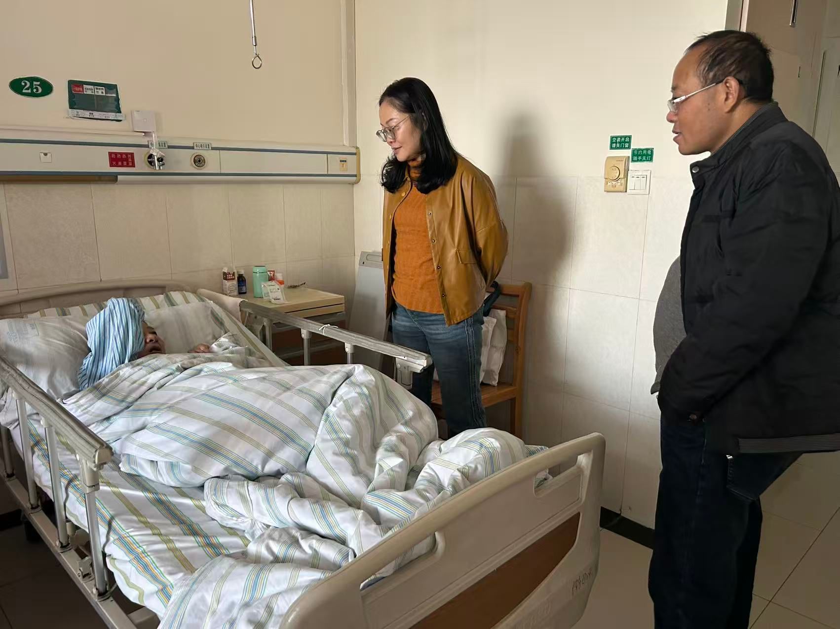 随后,大家专程前往中南医院,亲切看望慰问正在住院治疗的黄敏老师,详细询问其病情诊断结果、治疗进展以及目前的身体恢复状况,仔细叮嘱黄敏老师安心养病,争取早日康复。