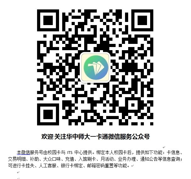 4.挂失方式:①各食堂及教学楼圈存机;②关注校园卡与ITS中心微信公众号。