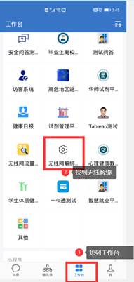 1.打开企业微信,点击工作台,找到“无线网解绑MAC”选项并点击。