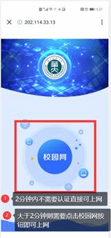 3.认证成功后,手机、电脑息屏或WiFi关闭,两分钟内再打开不需要认证可直接上网,超过两分钟则需要点击下图所示校园网按钮才可上网。