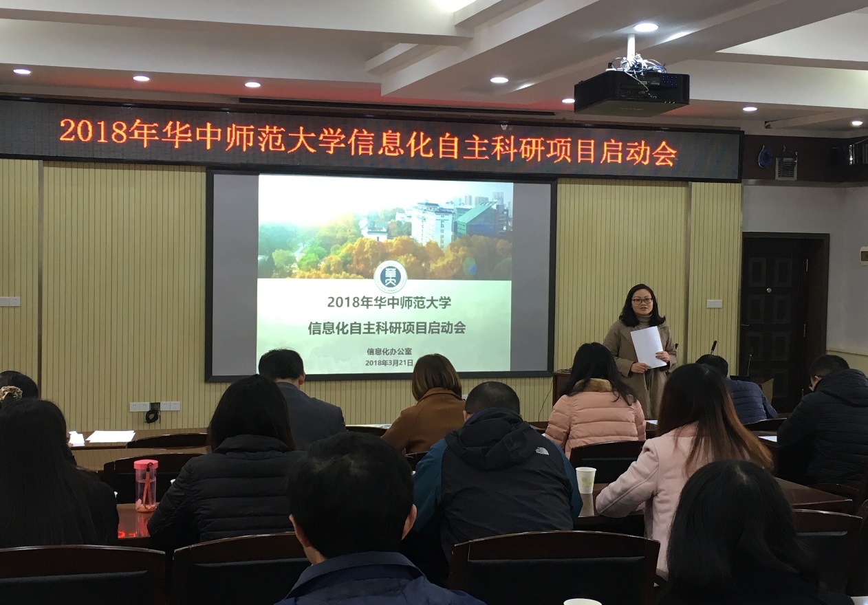 为进一步激发全校师生参与信息化建设的热情,引导师生正确开展信息化自主科研项目,3月21日下午,信息化办公室在行政楼二楼会议室召开2018年华中师范大学信息化自主科研项目启动会,信息化办副主任吴小平与谭冬霞、项目管理与发展部部长邓飞、科研部周汉鸣以及50多名项目负责人与会,会议由谭冬霞主持。