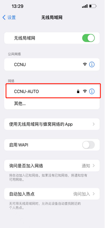 我校校园网无线信号源有两个,分别是CCNU、CCNU-AUTO。