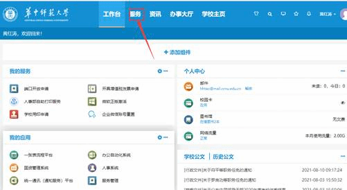 2、点击登陆后,跳转到门户首页,选择“服务”栏目