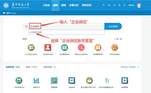 3、在服务栏目中搜索“企业微信”就可以出来跟企业微信相关的服务与应用了,选择“企业微信账号重置”服务。